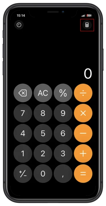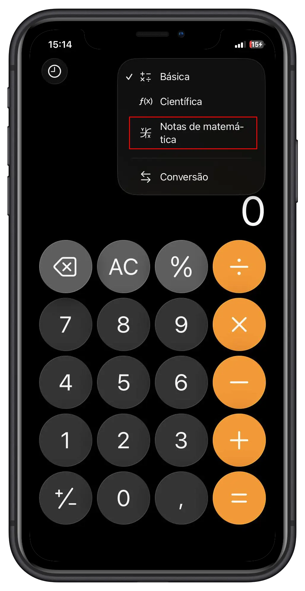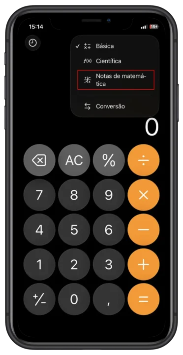 Para iniciar o processo, deve aceder à aplicação Calculadora no seu dispositivo e selecionar a opção "Notas de matemática" através do ícone da calculadora situado no canto superior direito (ou na barra lateral, no caso do Mac).
